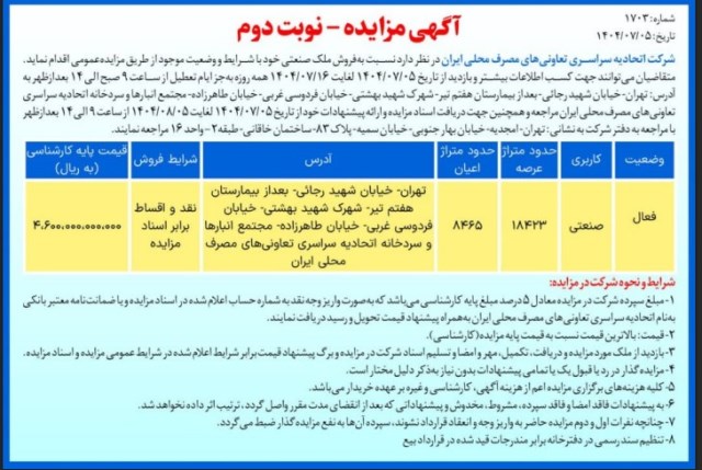 Read Moreاتحادیه سراسری تعاونیهای مصرف محلی ایران طی آگهی مزایده نوبت دوم، اعلام کرد ملک صنعتی خود را با شرایط و